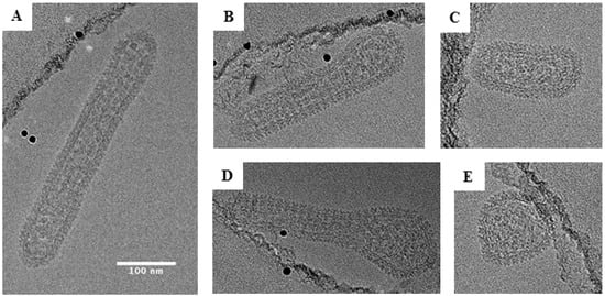 Representative cryo-EM images of Black Creek Canal virus. About 80% of the particles examined showed a tubular morphology as shown in panels (A–C). In panel (D), we show a representative image of an irregular virus particle. In panel (E), we show a representative image of a round virus particle. Scale bar: 100 nm.