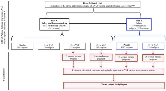 In 2009, our group conducted a phase 2 clinical trial following Good Clinical Practices according to the International Conference of Harmonization (ICH-GCP) to evaluate the safety and immunogenicity of a virus-like particle (VLP) vaccine against influenza A(H1N1)pdm09. That study was a randomized, placebo-controlled, double-blind clinical trial that included 4555 male and female volunteers. Healthy nonpregnant women (confirmed by a negative pregnancy test) were included in the study [7,8], and by written informed consent, women were requested to avoid pregnancy for the duration of the trial. The use of a contraceptive method was instructed and provided to female participants upon request; however, some of the volunteers became pregnant in the postvaccination follow-up period. As indicated by our institutional Ethics Committee recommendations and local regulations, the pregnant women and their infants remained under the intention to treat protocol, so they were closely monitored. The medical outcomes and antibody response to the vaccine in both the women and their infants were registered. Here, we report, in a nested cohort study, the results of the surveillance of the 40 pregnant women who agreed to take part and provided their informed consent.