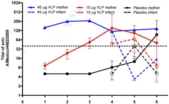 Vaccination with an inactivated or attenuated virus for influenza A has some disadvantages, such as the risk of anaphylactic reactions and requirements for annual boosters or high doses to reach protection [17,18,19,20]. We observed specific antibody titers to A/Mexico/4482/2009 in pregnant women in the placebo group; these antibodies may be passively transferred to the fetus. As we observed, these antibody titers are maintained up to 12 months after birth. About 30% of Mexican women who became pregnant during the period of the pandemic showed elevated antibody titers; accordingly, our data suggest that some women in the placebo group may have been naturally infected by the influenza virus and developed an antibody response that could be transferred to the fetus. One dose of 15 µg VLP vaccine was shown to elicit a transitory but protective titer in the perinatal period, which was maintained 12 months after delivery. A similar titer was detected in infants during the newborn period up to six months after birth, suggesting that one dose of 15 μg VLP is sufficient to elicit an antibody response. Considering 60% of these infants were breastfed throughout the first year of life, it is possible that antibodies may have been passively transferred during this period; thus, the 15 µg VLP dose may be considered sufficient to support passive immunity in the fetus and infant. Finally, the high titer that we found in the woman who was exposed to one dose of 45 µg VLP vaccine suggests an asymptomatic infection with the pandemic influenza virus, and this condition may have interfered with the response to the 45 µg VLP vaccine. However, the titer remained elevated and the antibodies were passively transferred to the neonate at the moment of delivery but were not sustained at six months. Taken together, our data suggest that 15 µg may be an adequate dose of VLP vaccine to elicit an adequate antibody titer in both mother and infant. Another clinical trial is necessary to demonstrate if the 15 µg dose of the VLP vaccine could be considered protective against pandemic influenza in women who become pregnant.