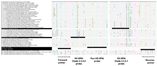 Design of the primer/probe set for the one-step multiplex RT-qPCR assay. Alignment of nucleotide sequences within the hemagglutinin (HA) gene of H5Nx avian influenza viruses that are representative of highly pathogenic avian influenza (HPAI) clades and low pathogenic avian influenza (LPAI) virus. The sequences of primers and probes specific to each target are on black background, and the reverse primer and probe specific for clade 2.3.2.1 show reverse complement sequence (R = A/G, Y = C/T, V = A/C/G).