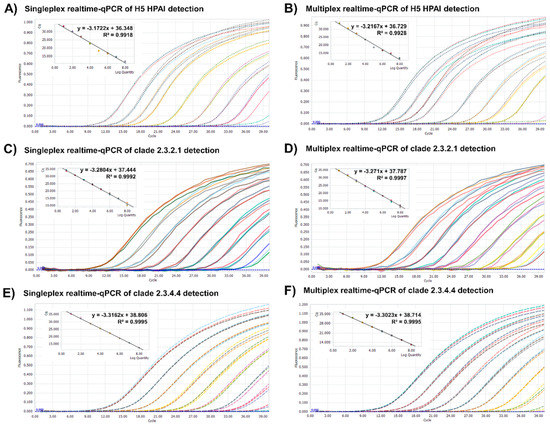 Amplification plots and standard curves of the singleplex and multiplex realtime-qPCR assays using target-specific plasmid DNA. Comparison of the singleplex (A,C,E) and multiplex (B,D,F) realtime-qPCR assays was performed using standard plasmids corresponding to H5 HPAI and clades 2.3.4.4 and 2.3.2.1; each plasmid solution was serially diluted down to 5 × 108 to 5 × 100 copies of plasmid DNA/microliter. The cycle threshold in amplification plots, correlation coefficient (R2) and slope of the standard curve for the assays were drawn automatically by Lightcycler 96 software. Each concentration had triple replicates.