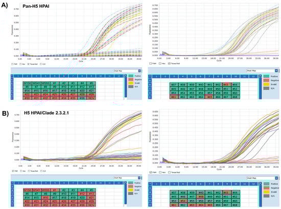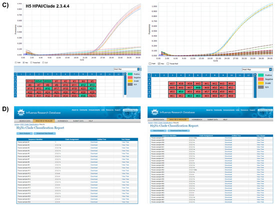 To detect H5 HPAI in fecal samples using our one-step multiplex RT-qPCR assay, we obtained a total of 4350 fecal samples from domestic chickens with signs of respiratory illness in Vietnam, and viral RNA was isolated from these samples. A total of 68 samples were confirmed influenza positive by M-gene-specific RT-qPCR. Among the IAV-positive clinical samples, 51 samples were H5 HPAI-positive, and each clade was successfully analyzed using our one-step multiplex RT-qPCR assay (Table 3 and Figure 3). Next, we confirmed the sequence of all H5 HPAI-positive samples using the universal HA sequencing primers, forward 5′-GCATTGGYTAYCATGCAAAYA-3′ and reverse 5′-TTGCTRTGGTGRTAYCCATACA-3′, and classified each clade using the Influenza Research Database. Interestingly, when we have compared with sequencing analysis and clade identification using each amplicon, the primers and probes for the pan-H5 HPAI-specific and two clade-specific multiplex RT-qPCR assays were well-matched (Figure 3D). These results show that our one-step multiplex RT-qPCR assay could be a promising technique for specific discrimination of multiple H5 HPAI viruses in field samples from infected avian species.