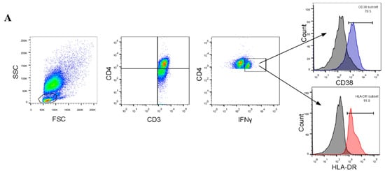 After stimulation with TB proteins, PBMCs were stained with appropriate antibodies to identify different T-cell subsets specific for TB. This was done using anti-CD3 FITC (clone UCHT1), anti-CD4 PerCP/Cy5.5 (clone L200), anti-HLA-DR APC (clone 243), and anti-CD38 PE-Cy7 (clone HIT2). These were all obtained from BioLegend (San Diego, CA, USA). Cells were then fixed and permeabilized with a Cytofix/Cytoperm Kit (BD Biosciences) and stained intracellularly with anti-IFN-γ pacific blue (clone 4S.B3). Cells were acquired in a FACSCanto II (BD Biosciences), and data were analyzed using FlowJo software 7.6.1 (Tree Star Inc., Ashland, OR, USA). Figure 1A shows the gating strategy used to determine different T-cell subsets.
