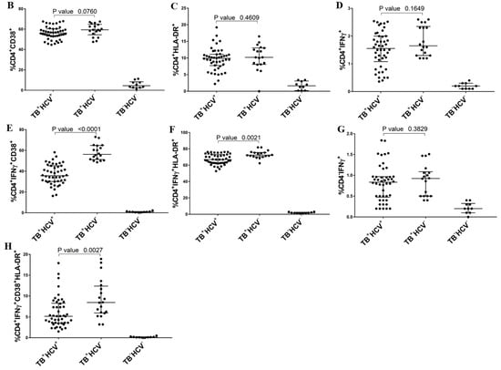 Earlier studies examined the immune profiles of TB- and HCV-infected patients separately or in the presence of HIV infection. These studies showed the phenotypes and frequencies of antigen-specific CD4+ and CD8+ T-cell phenotypes in each disease [,]. HIV and HCV coinfections, chronic immune activation, immune dysfunction, and loss of CD4+ T cells favor the emergence of active TB in HIV patients. Reciprocally, the host’s immune response to TB has been shown to increase HIV-1 replication and accelerate the natural progression to AIDS [,,]. However, there have been no previously published studies on the immune profiles of TB/HCV patients.