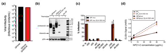 Pseudovirions were produced as described above by co-transfection of plasmids encoding HIV-1 backbone and either GPΔmuc or GPΔmuc 32-A1/501-A4, at a 1:1 ratio. Immediately before use, pseudoparticles were concentrated and treated for 1 h at 37 °C with 0.25 mg/mL thermolysin (Promega, Madison, WI, USA) in 50 mM Tris-HCl pH8, 0.5 mM CaCl2. The uncleaved control was incubated in the same way in the absence of thermolysin. Reactions were terminated with EDTA. ELISAs to determine NPC1-C binding to GPΔmuc or GPCL were preformed based on previously published methods [6,20]. Briefly, high-binding 96-well ELISA plates (Thermo Fisher, Waltham, MA, USA) were coated with concentrated pseudoparticles diluted in PBS. Plates were blocked with 2% milk containing 3% bovine serum albumin in PBS. Unbound virus was washed off and 10-fold dilutions of NPC1-C (0–40 µg/mL) were added. Bound NPC1-C was detected with the horseradish peroxidase-conjugated anti-FLAG antibody (Millipore Sigma, Burlington, MA, USA) followed by Ultra-TMB substrate (Thermo Fisher, Waltham, MA, USA). All incubations were performed for 1 h at 37 °C.