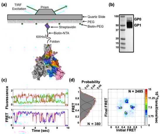 Retroviral pseudoparticles containing a single fluorescently labeled GP protomer per virion were generated by transfection of HEK293T cells with Lipofectamine 3000 Reagent (Thermo Fisher, Waltham, MA, USA) at a 5:1 ratio of pNL.4-3R-E- over plasmid encoding GP. Plasmid encoding GP consisted of a 50:1 mixture of plasmid encoding wild-type GPΔmuc:GPΔmuc 32-A1/501-A4. Virus was harvested 48 h after transfection, concentrated and labeled with fluorophores as described [22]. Briefly, harvested virus was concentrated by ultracentrifugation through a 10% sucrose cushion for 2 h at 25,000× g, resuspended in labeling buffer (50 mM HEPES pH 7.5, 10 mM MgOAc) and incubated overnight with 0.5 µM each of fluorophores LD550-CoA and LD650-CoA and 5 µM of the labeling enzyme AcpS. To facilitate surface-immobilization of labeled virions for imaging, DSPE-PEG2000-biotin (Avanti Polar Lipids, Alabaster, AL, USA) lipid was added to samples and incubated at room temperature for 30 min. Labeled virus was purified from unbound fluorophores and lipid by ultracentrifugation through a 6–30% OptiPrep (Millipore Sigma, Burlington, MA, USA) density gradient for 1 h at 35,000× g, and virus-containing fractions were identified by immunoblot for GP and p24.