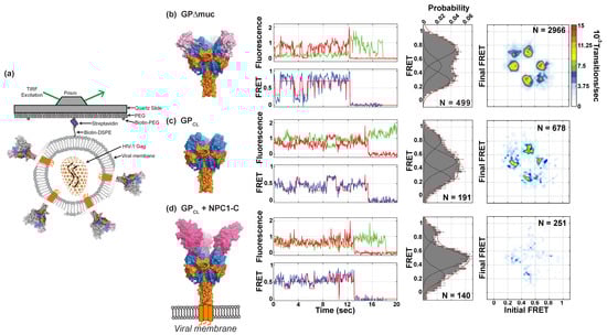 All smFRET data was processed and analyzed using the SPARTAN software package (https://www.scottcblanchardlab.com/software) in Matlab (Mathworks, Natick, MA, USA) [24]. smFRET trajectories were identified according to four criteria: (i) exceeded a minimum total fluorescence intensity; (ii) duration of smFRET trajectory exceeded 15 frames; (iii) correlation coefficient calculated from the donor and acceptor fluorescence trajectories was less than −0.1; and (iv) signal-to-noise ratio was greater than 8. Due to greater heterogeneity in the smFRET data acquired on pseudovirion-associated GP, trajectories that passed these criteria where then verified manually. Hidden Markov model (HMM) selection was performed using the Baum-Welch algorithm, with correction of the maximized log-likelihood for different numbers of model parameters using the Akaike information criterium (AIC) [25]. smFRET trajectories were idealized to the determined model using the segmental k-means algorithm [26] implemented in SPARTAN.
