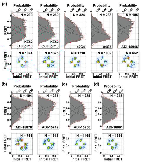 We next asked whether nAbs might function by remodeling GP in a manner that is distinct from proteolytic cleavage and NPC1 binding. In particular, antibodies that interact with GP proximal to the fusion loop are predicted to function by preventing conformational changes necessary for membrane fusion. The antibody KZ52 showed a modest concentration-dependent stabilization of the low-FRET state, which was most pronounced at the saturating concentration of 500 µg/mL (Figure 5a). This mild effect on GP conformation is consistent with reports of KZ52 incompletely neutralizing EBOV [19,29]; KZ52 may also function by limiting proteolytic cleavage by cathepsins [30]. Additional nAbs were tested at 15 µg/mL, a concentration that yields minimally 90% neutralization (Figure 2b). The base-binding antibodies c2G4 and c4G7 [31,32] also stabilized the low-FRET state, to a greater extent than KZ52 (Figure 5a). In contrast, ADI-15946, an antibody that competes with KZ52 but bridges the GP1 core and glycan cap [33,34,35], modestly stabilized the high-FRET state. We also tested nAbs ADI-15878 and ADI-15742, which contact the GP2 fusion loop and adjacent GP1 protomer [33,34,36]. These nAbs significantly increased the occupancy in the high-FRET state (Figure 5b). The glycan-cap binding nAb ADI-15750 slightly stabilized the low-FRET state (Figure 5c) [33]. Finally, the GP2 stalk-binding nAb ADI-16061 (Figure 5d) showed no detectable change in FRET-state occupancy compared to unliganded GP, indicating that the current fluorophore placement does not report on its mechanism of action [33]. In all cases, transitions to all three FRET states persisted as indicated by the TDPs. Notably, all the nAbs tested stabilized states distinct from proteolytic cleavage and NPC1-C binding. This suggests that their mechanisms of action may be to inhibit transition to the intermediate-FRET conformation.