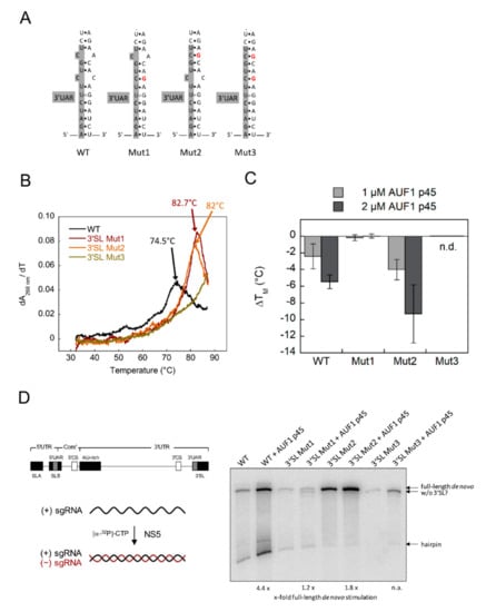 Next, we tested how the mutations affected AUF1 p45-supported WNV negative-strand RNA synthesis. For this purpose, we performed a previously established in vitro replicase assay using the purified WNV RNA-dependent RNA polymerase (RdRp) NS5 and, as a template, a subgenomic RNA (sgRNA). The assay essentially generates two RNA products, namely a negative-strand RNA product, which results from de novo initiation of RNA polymerization on the template, and a hairpin product, which is synthesized by priming at the 3′-OH of the template and turn-around copy-back polymerization by the NS5 RdRp []. De novo RNA synthesis by NS5 itself was clearly affected by the mutations in the 3′SL. With the 3′SL Mut1 sgRNA we observed an evident decrease in the amount of the full-length de novo RNA product as compared with the wild-type control (Figure 2D). With the 3′SL Mut2 sgRNA template, the ratio of the NS5-generated de novo product to the hairpin product was changed in favor of the de novo synthesized RNA, suggesting that this mutation inhibited the capability of NS5 to prime RNA synthesis at the template’s 3′-end. Interestingly, when using the 3′SL Mut3 as a template, NS5 was unable to produce the full-length RNA, and only resulted in a shorter RNA product. This indicates that with the most stable variant, 3′SL Mut3, NS5 is incapable of de novo initiation of RNA synthesis at the very 3′-end, but rather initiates upstream of the 3′SL. As observed previously [], AUF1 p45 was able to promote negative-strand RNA synthesis by the polymerase NS5 using the wild-type sgRNA as a template (Figure 2D). Remarkably, with the sgRNA 3′SL Mut1 we did not observe an increase in the amount of the full-length de novo RNA product in the presence of AUF1 p45, but rather detected an additional shorter product was made (Figure 2D). With the 3′SL Mut2 sgRNA template, de novo negative-strand RNA synthesis was stimulated in the presence of AUF1 p45, but this was less efficient than with the wild-type sgRNA. When using the 3′SL Mut3 sgRNA as a template, we observed an increase in the amount of the shorter RNA product in the presence of AUF1 p45, but no full-length de novo RNA product was observed (Figure 2D).