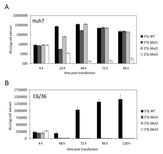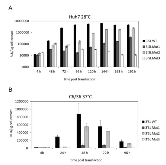 The replication of the wild-type replicon RNA in the C6/36 cells that were cultured at 37 °C after transfection increased significantly already after 24 h and, accordingly, showed no lag phase (Figure 4B). Therefore, an elevated temperature leads to an acceleration of the replication of WNV RNA in C6/36 cells. Strikingly, the 3′SL Mut1 and 3′SL Mut2 replicons, which were replication-deficient at 28 °C, replicated at a cultivation temperature of 37 °C, although with a delayed phenotype and with lower efficiency as compared with the wild-type. The replicon containing the 3′SL Mut3 mutation was replication-deficient at 37 °C, as it was at 28 °C (Figure 4B). These results indicate that the cultivation temperature decisively determines the replication efficiency of the viral RNA in human and mosquito cells. Thus, the longer lag phase of the replication process of the WNV replicon in mosquito cells was indicated not to be cell specific but rather to depend on the cultivation temperature.