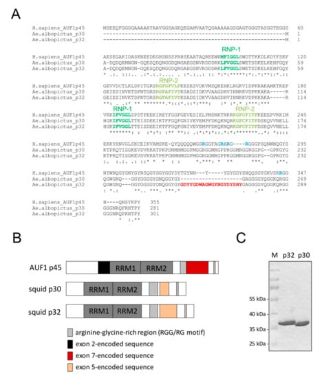 Mosquito cells encode two AUF1-homologous proteins. (A) Alignment of human AUF1 p45 and A. albopictus proteins p30 and p32. Conserved RNP-1 (light green) and RNP-2 (green) sequences of the RNA recognition motifs (RRM) are highlighted. The arginine residues of the RGG/RG motif of AUF1 p45 that were found to be dimethylated in human cells are highlighted in blue. The alternatively spliced sequence that is absent in p30 but present in p32 is shown in red. (B) Domain organization of human AUF1 p45 and mosquito squid proteins p30 and p32. (C) AUF1-homologous proteins p30 and p32 were produced in, and purified from, E. coli. About 4 μg of protein were analyzed on a Coomassie-stained SDS-gel in parallel with a molecular weight marker (M).