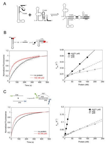 Mosquito proteins p30 and p32 exhibit RNA chaperone and RNA annealing activities. (A) Scheme of the structural rearrangement of the 5ʹ and 3ʹ termini, specifically of the 5ʹUAR and 3ʹUAR, as well as 5′CS and 3′CS elements, during cyclization of the WNV RNA genome. (B) (Top) Scheme of the fluorescence-based 3′SLtrunc-5ʹUAR chaperone assay to detect protein-mediated conformational rearrangement of WNV RNA by dequenching of Cy5. (Bottom) Exemplary kinetic traces with Cy5 and BHQ (black hole quencher) labeled 3′SLtrunc incubated with or without 100 nM of p32. Following the addition of 5ʹUAR RNA the fluorescence signals were measured, plotted as a function of time, and fitted according to a first-order reaction (no protein, Equation (2)) or second-order reaction (in the presence of protein, Equation (3)). (Right) The observed rate constants kobs (s−1) that were measured for the RNA chaperoning reaction in the presence of AUF1 p45, p30, or p32 were plotted as a function of the protein concentration. (C) (Top) Scheme of the fluorescence-based 5ʹCS-3ʹCS RNA annealing assay to analyze the hybridization of the CS cyclization sequences. Annealing of the complementary 5′- and 3′CS RNAs that are fluorescently labeled with Cy5 and Cy3, respectively, leads to a detectable FRET signal. (Bottom) Exemplary kinetic traces of the RNA–RNA interaction in the absence or presence of 50 nM p30. The fluorescence signals were analyzed according to a second-order reaction (Equation (3)). (Right) The observed rate constants kobs (s−1) that were measured for the RNA annealing reaction in the presence of AUF1 p45, p30, or p32 were plotted as a function of the protein concentration.
