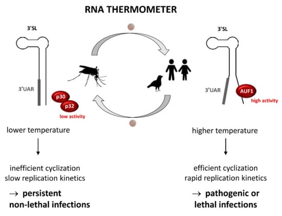 The temperature shift, upon entering the natural vertebrate host, releases the silencing effect of the 3′SL leading to increased cyclization and replication rates and high virus titers accompanied by cytopathic effects. A so-called RNA thermometer activity in order to switch from a stable to a flexible 3′SL could be involved in modulating the replication efficiency during host switching (Figure 9). RNA thermometers are well characterized in bacterial pathogens where they coordinate temperature-dependent gene expression. These temperature-sensing structured RNA sequences switch from closed to open conformations and modulate translation efficiency [].