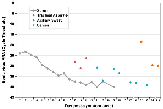 - Barnes, K.G.; Kindrachuk, J.; Lin, A.E.; Wohl, S.; Qu, J.; Tostenson, S.D.; Dorman, W.R.; Busby, M.; Siddle, K.J.; Luo, C.Y.; et al. Evidence of Ebola Virus Replication and High Concentration in Semen of a Patient During Recovery. Clin. Infect. Dis. 2017, 65, 1400–1403. [Google Scholar] [CrossRef] [PubMed]