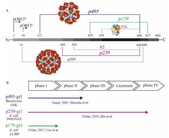 Presentation of different truncated versions of hepatitis E virus (HEV) pORF2. (A) shows the molecular structure of truncated pORF2, and (B) shows three existing HEV vaccines, which have been studied in clinical trials. HEV pORF2 consists of 660 amino acids. HEV p595 (aa 14–608) can form a virus-like particle (VLP) that is similar to the native virion. The structure of p595 was demonstrated by cryo-EM. HEV p495 (aa 112–608) can form a VLP, and the structure has been determined by X-ray. HEV p495 was used as a vaccine antigen manufactured by GSK, which showed good safety and efficacy in a phase II clinical trial. HEV p239 (aa 368–606), named Hecolin®, has been licensed in China. The HEV p179 (aa 439−617)-based vaccine, which was manufactured by Changchun Institute of Biological Products Co., Ltd. (CCIBP), was safe and well tolerated in a phase I clinical trial. E2 was a useful candidate for diagnostic reagents and was able to form hexamers in solution. The structure of E2s (aa 459–606), the shortest version to form a dimer harbouring the major neutralizing epitopes, was determined at a high resolution.