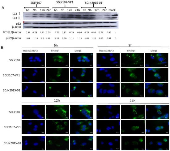To explore the mechanism by which the VP1 gene affects the replication ability of virus in nerve cells, autophagy, which has been proven to be related to viral replication, was quantitatively analyzed. SH-SY5Y cells were infected with the three strains. Cell lysates were collected at 6 h, 9 h, 12 h, and 24 h. Uninfected cells served as the sham control. LC3 and p62 were examined by western blot analysis. SDLY107 strain infection resulted in an increase in the LC3 and p62 content, but the SDJN2015-01 strain and SDLY107-VP1 strain did not cause significant changes in LC3 and p62 levels (Figure 4A,C,D). This indicated that SDLY107 could inhibit autophagic flux in SH-SY5Y cells. The SDLY107-VP1 and SDJN2015-01 strains did not have a significant impact on autophagic flux in SH-SY5Y cells. Figure 4B and 4E shows the fluorescent staining of autophagosomes in SH-SY5Y cells. The number of autophagosomes in SH-SY5Y cells infected with SDLY107 strain increased with the prolongation of infection time. However, the number of autophages did not increase significantly after infection with SDLY107-VP1 and SDJN2015-01 strains. This indicated that SDLY107 could lead to the accumulation of autophagosomes, which is beneficial for viral replication. The replacement of VP1 attenuated the inhibition of autophagic flow by virulent strains in SH-SY5Y cells.
