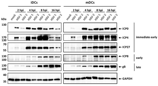 For in vitro generation of DCs, peripheral blood mononuclear cells obtained by leukapheresis from healthy donors were purified and monocytes were differentiated into DCs by cultivation in IL-4- and GM-CSF-conditioned medium. The resulting iDCs were either infected with HSV-2 strain G or HSV-1 as control, and harvested at 2, 4, 8, or 16 hpi or matured into mDCs, via stimulation with a maturation cocktail, additionally containing IL-1β, IL-6, TNF-α, and PGE2, followed by the same infection procedure as for iDCs. To investigate whether HSV-2 is able to efficiently infect mDCs, Western blot analyses were performed for detection of proteins specific for each of the three viral gene expression phases, i.e., immediate early (ICP0, ICP4, ICP27), early (ICP8), or late (gB; Figure 1).