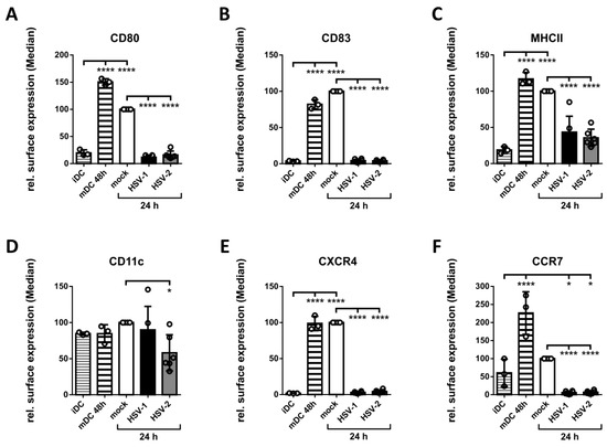 HSV-2 inhibits DC maturation. Immature DCs were generated and either directly used for flow cytometric analyses, serving as input control, or mock-, HSV-1- (MOI of 2) and HSV-2-infected (MOI of 5) followed by addition of the maturation cytokine cocktail. After 24 h, DCs were subjected to flow cytometric analyses. Additionally, 48 h matured mock-treated DCs served as a positive control. The cells were stained with specific fluorochrome-labeled antibodies directed against (A) CD80, (B) CD83, (C) MHCII, (D) CD11c, (E) CXCR4, and (F) CCR7. Median values are shown as percentages relative to 24 h matured mock-treated DCs. The experiment was performed at least three times with cells from different healthy donors. Error bars indicate ± SD. Significant changes (**** = p < 0.0001; * = p < 0.05) are marked by asterisks.