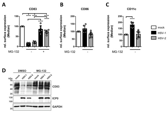 Next, we tested for protein expression of the well-described maturation marker CD83 on HSV-2-infected mDCs. This glycoprotein was previously shown to undergo strong proteasomal degradation upon HSV-1 and HCMV infection of mDCs [79,91]. To examine whether HSV-2 similarly triggers the downmodulation of CD83 on/in mDCs, we performed HSV-2 infection studies with or without application of the proteasomal inhibitor MG-132. Subsequently, flow cytometric analyses of surface-expressed CD83, CD86, or CD11c, and Western blot experiments for the verification of total CD83 levels were conducted (Figure 3 and Figure S3).