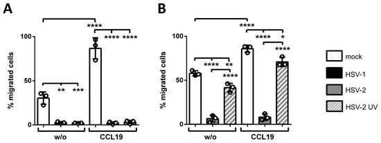 Figure 4 clearly indicates successful induction of transwell migration of mock-infected cells (white bars) upon addition of CCL19, in comparison to spontaneous migration without any chemokine, at 24 hpi (Figure 4A) as well as 4 hpi (Figure 4B). In line with our recent findings, HSV-1 (black bars) drastically inhibited spontaneous and CCL19-mediated mDC chemotaxis 24 hpi (Figure 4A) [57,88]. Residual migration capability of infected mDCs was less than 10% of input cells, compared to approximately 90% of mock-treated cells (white bars). More importantly, the data of this experiment revealed HSV-2 to equally hamper CCL19-directed mDC migration under the herein used conditions compared to HSV 1 at 24 hpi.