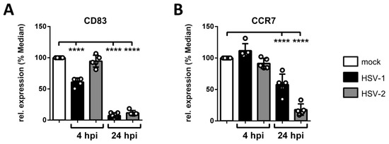 Pathogen-mediated modulation of chemokine receptor surface expression constitutes a mechanism to hijack cell migration, since proper expression of chemokine receptors is a prerequisite for directed chemotaxis toward the respective chemokine. Previously, our group demonstrated that HSV-1 significantly reduces the expression of the CCL19-sensing chemokine receptor CCR7 on mDCs from 8 hpi onwards [88]. Hence, expression levels of the chemokine receptor CCR7 was monitored on mock-, HSV-1- and HSV-2-infected mDCs via flow cytometry at 4 and 24 hpi to verify whether the observed block in CCL19-directed migration at 4 hpi is associated with reduced CCR7 levels or not (Figure 5 and Figure S4). Additionally, we stained for CD83 serving as a known downmodulated target during an HSV-1 or HSV-2 infection of mDCs.