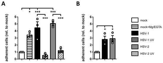 As previously described for HSV-1-infected mDCs, inhibition of mDC migration not only depends on proper expression of specific chemokine receptors but also on the precise regulation of mDC adhesion [57]. It is therefore reasonable to assume that also in the context of an HSV-2 infection, increased adhesion might contribute to the inhibition of mDC migration. Thus, mock-treated and HSV-1-, HSV-1 UV-, HSV-2-, or HSV-2 UV-infected mDCs were harvested 4 hpi and subjected to adhesion assays on the extracellular matrix protein fibronectin. As a positive control, mock-infected cells were incubated with Mg/EGTA to induce the activity of the β2 integrin LFA-1 and thus adhesion (Figure 6A). Treatment with Mg2+ ions promotes a conformational change from the inactive into the active epitope, while simultaneous presence of the chelator EGTA specifically depletes Ca2+ ions, which inhibit β2 integrin activity [87,93]. Moreover, the treatment with Mg/EGTA selectively induces the activated epitope of the β2 integrin LFA-1, but not that of Mac1 [87].