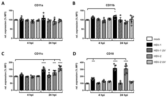 After four hours of infection, CD11a/b/c surface expression levels were unaffected in any of the indicated infection conditions. In contrast, CD18 surface expression was approximately 1.5-fold upregulated on HSV-1-but not on HSV-2-infected mDCs (Figure 7D). Later during infection, i.e., 24 hpi, surface expression levels of CD11c revealed a weak induction on HSV-1-, HSV-2-, and HSV-2 UV-infected mDCs compared to mock cells. Moreover, HSV-1- and HSV-2-infected mDCs displayed an approximately three-fold upregulation of CD18.