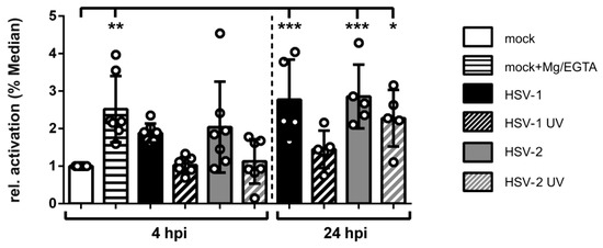 Considering that integrins are constitutively expressed but not constitutively active, their activation status might be modulated during an HSV-2 infection of mDCs, which was previously described in the context of HSV-1 [57]. Thus, the activation status of β2 integrins on HSV-2-infected mDCs was analyzed 4 hpi as well as 24 hpi (Figure 8 and Figure S6). As controls, HSV-1-infected as well as Mg/EGTA-treated mock controls were further included in this experiment. To investigate the ligand binding state of β2 integrins, the antibody mAB24 that exclusively recognizes the activated epitope was used for flow cytometric analyses [94,95,96].