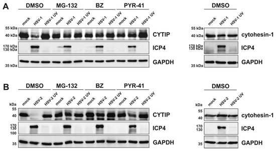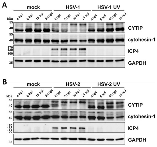 In accordance with previous reports, HSV-1-infected mDCs showed progressive reduction of CYTIP protein expression from 4 hpi onwards, compared to their uninfected counterparts (Figure 9A) [57]. Interestingly, also HSV-2 negatively influenced CYTIP protein levels. CYTIP downmodulation was detected from 4 hpi onwards, with an almost complete absence of CYTIP protein expression at 24 hpi. Moreover, by probing the blots with the αCYTIP hybridoma supernatant, we detected an additional band of approximately 55 kDa that increases upon infection and might constitute post-translationally modified CYTIP protein. Apart from this, cytohesin-1 protein levels were only slightly affected upon an HSV-1 or HSV-2 infection of mDCs. Furthermore, while treatment with HSV-1 UV-inactivated virions did not severely hamper the expression of CYTIP or cytohesin-1, HSV-2 UV-inactivated virions mediated a notable loss of their expression levels from 16 hpi onwards.