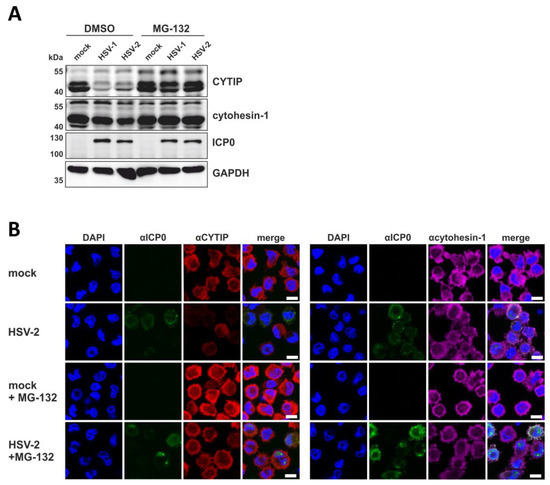 To mechanistically analyze the HSV-2-mediated downmodulation of CYTIP protein levels, we tested whether inhibition of the proteasome restores CYTIP protein levels in infected mDCs. Therefore, mock- or HSV-2-infected mDCs, or HSV-1 as control, were treated with or without 10 µM of the proteasomal inhibitor MG-132 at 1 hpi. Cells were harvested 16 hpi and subsequently lysed for Western blot analyses to detect CYTIP as well as cytohesin-1 protein expression (Figure 10A).