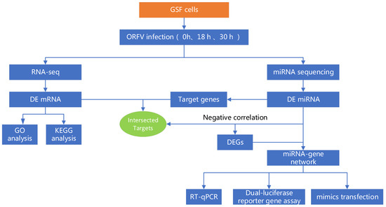 The role of miRNAs in ORFV infection and the mechanisms by which ORFV and host cells interact remain largely unknown. Therefore, in the present study, we performed miRNA sequencing and RNA-seq at three different infection times (0, 18, 30 h). Differentially expressed miRNAs and genes were analyzed at 18 and 30 h.p.i to identify potential ORFV responsive miRNA-gene regulatory networks existing in GSF cells. Figure 1 provides a summary flow chart of the present work. The current study provides new insights into ORFV-host interaction mechanisms.