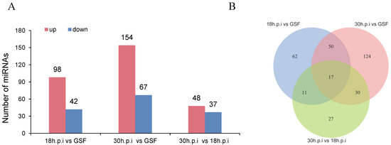 Differentially expressed miRNAs in 18h.p.i vs. GSF, 30h.p.i vs. GSF, and 30h.p.i vs. 18h.p.i. (A) Bar chart of DE miRNAs in 18h.p.i vs. GSF, 30h.p.i vs. GSF, and 30h.p.i vs. 18h.p.i. (B) Venn diagram of DE miRNAs in 18h.p.i vs. GSF, 30h.p.i vs. GSF, and 30h.p.i vs. 18h.p.i.
