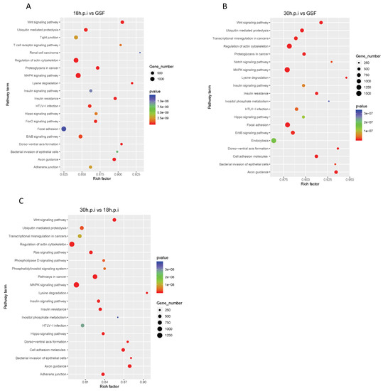KEGG enrichment analyses of DEGs in 18h.p.i vs. GSF, 30h.p.i vs. GSF and 30h.p.i vs. 18h.p.i. (A). KEGG enrichment analysis of DEGs in 18h.p.i vs. GSF. (B) KEGG enrichment analysis of DEGs in 30h.p.i vs. GSF. (C) KEGG enrichment analysis of DEGs in 30h.p.i vs. 18h.p.i.