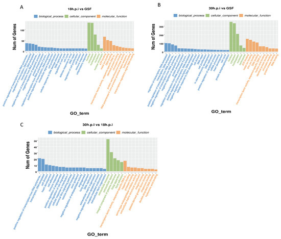 GO enrichment analyses of DEGs in 18h.p.i vs. GSF, 30h.p.i vs. GSF and 30h.p.i vs. 18h.p.i. (A) GO enrichment analysis of DEGs in 18h.p.i vs. GSF. (B) GO enrichment analysis of DEGs in 30h.p.i vs. GSF. (C) GO enrichment analysis of DEGs in 30h.p.i vs. 18h.p.i.