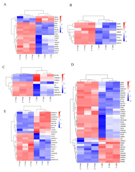 The clustered heatmaps of cellular immune response genes in the 18h.p.i vs. GSF comparison and positive and negative regulation of apoptosis genes identified in the 30h.p.i vs. GSF comparison. (A) Heatmap of DEGs enriched in negative regulation of apoptotic process in the 18h.p.i vs. GSF comparison. (B) Heatmap of DEGs enriched in defense response to virus in the 18h.p.i vs. GSF comparison. (C) Heatmap of DEGs enriched in immune and inflammatory response in the 18h.p.i vs. GSF comparison. (D) Heatmap of DEGs enriched in negative regulation of apoptotic process in the 30h.p.i vs. GSF comparison. (E) Heatmap of DEGs enriched in positive regulation of apoptotic process in the 30h.p.i vs. GSF comparison.