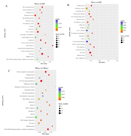 A total of 42, 37, and 34 pathways were significantly enriched in the 18 h.p.i vs. GSF, 30 h.p.i vs. GSF, and 30 h.p.i vs. 18 h.p.i comparisons, respectively. The top 20 significantly enriched pathways identified in the three comparisons are presented in Figure 5. In the 18 h.p.i vs. GSF comparison, cell cycle, TNF, p53, Toll-like receptor, NF-κB, and chemokine signaling pathways were significantly enriched (Figure 7A). In the 30 h.p.i vs. GSF comparison, cell cycle, p53, TNF, phosphoinositide 3-kinase -protein kinase B (PI3K-Akt), and apoptosis pathways were significantly enriched (Figure 7B). In the 30 h.p.i vs. 18 h.p.i comparison, PI3K-Akt, p53, cell cycle, and cytokine-cytokine receptor interaction pathways were significantly enriched (Figure 7C).