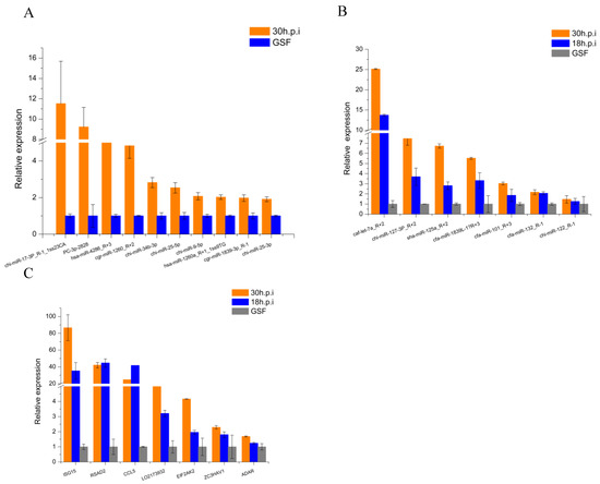 RT-qPCR validation of DE miRNAs and DEGs. (A) RT-qPCR validation of DE miRNAs in 30h.p.i vs. GSF. (B) RT-qPCR validation of DE miRNAs in both 18h.p.i vs. GSF and 30h.p.i vs. GSF. (C) RT-qPCR validation of DEGs.