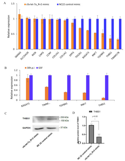 Overall, THBS1 was downregulated much more than other four cfa-let-7a targets based on the above results. Furthermore, previous studies reported that THBS1 was related to apoptosis [33,34] which was an important immune mechanism used by cells against viral infection. Therefore, we first selected THBS1 for Western blot analysis. THBS1 protein expression levels were detected after 48 h following cfa-let-7a_R+2 mimic or NC 22 control mimic transfection. Results indicate that cfa-let-7a_R+2 mimic significantly reduced THBS1 protein expression compared with the control mimic (Figure 9C,D).