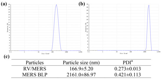The particle size and polydispersity index of RV/MERS and MERS BLP were measured by a dynamic light scattering (DLS) device before immunization of mice. As shown in Figure 1, the size of RV/MERS is about 167 nm (Figure 1a); the size of MERS BLP is about 2161 nm (Figure 1b).