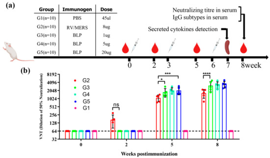 Schematic diagram of immunization and neutralizing antibody responses. (a) The vaccination schedule and characterization of immunologic responses in BALB/c mice. A total of five groups of mice were immunized and detected for virus-neutralizing antibody, IgG subtypes, and cytokines release. Group 1 (G1) was negative controls; group 2 (G2) was vaccinated with inactivated and purified rabies virus (RV)/Middle East respiratory syndrome (MERS); group 3, group 4, and group 5 (G3, G4, G5) were vaccinated with varying doses of the MERS bacterium (Lactococcus lactis)-like particle (BLP). All groups received a second and third identical vaccination boost with a combined adjuvant at 3-week intervals after the primary immunization. (b) Neutralizing activity was detected by using MERS coronavirus (MERS-CoV) pseudovirus, and the data are shown as the mean ± SD from five mice in each group and were analyzed by Student’s t-test (* p < 0.05, *** p < 0.001, **** p < 0.0001, n = 5).