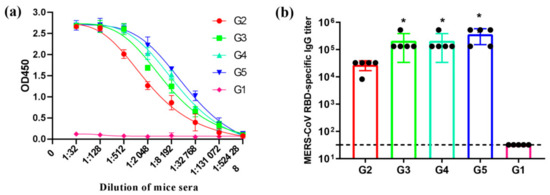 MERS-CoV receptor-binding domain (RBD)-specific IgG antibodies. Sera from 2 weeks after the last immunization were tested for MERS-CoV RBD-specific IgG antibodies by enzyme-linked immunosorbent assay (ELISA). The data are shown as the mean ± SD from five mice in each group and were analyzed by Student’s t-test (* p < 0.05, n = 5). (a) The total IgG antibodies specific to MERS-CoV RBD protein were assessed by ELISA. The level of the MERS-CoV RBD-specific IgG (b) antibodies was determined by ELISA and is shown as end-point dilution titers.