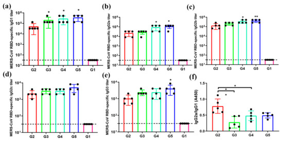 MERS-CoV RBD-specific antibody subtypes response. Sera from 2 weeks after the last immunization were tested for MERS-CoV RBD-specific IgG, IgG1, IgG2a, IgG2b, IgG2c, and IgG3 antibodies by ELISA. The data are shown as the mean ± SD from five mice in each group and were analyzed by Student’s t-test (* p < 0.05, ** p < 0.01, n = 5). The level of the MERS-CoV RBD-specific IgG1 (a), IgG2a (b), IgG2b (c), IgG2c (d), and IgG3 (e) antibodies were determined by ELISA and are shown as end-point dilution titers. The ratios between IgG1 and IgG2a antibody responses were also calculated (f).
