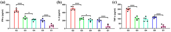 T helper 2 (Th2) response is associated with IgG1, and T helper 1 (Th1) response correlates with IgG2a, IgG2b, IgG2c, and IgG3 in mice [26]. In order to evaluate the IgG subtypes’ levels in serum from immunized mice, the production of IgG1, IgG2a, IgG2b, IgG2c, and IgG3 in sera were detected. Observation of sera IgG subtypes showed that the sera in G3–G5 induced significantly higher levels of IgG1 antibody than those of G2 (Figure 4a); the sera in G4–G5 induced significantly higher levels of IgG2a and IgG2b antibodies than those of G2 (Figure 4b,c); there was no significant difference in IgG2c antibody level between G2–G5 (Figure 4d); the sera in G5 induced significantly higher levels of IgG3 antibody than those of G2 (Figure 4e). However, further analysis of the ratios of IgG2a/IgG1 revealed that the sera in G2 were remarkably higher than those in G3–G5 (Figure 4f). Collectively, these results suggest that the MERS-CoV antigen protein displayed on the surface of the viral vector appears to induce a stronger Th1-biased immune response than that on the bacterial vector.