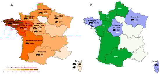 Geographical location of domestic pig and wild boar samples that were analyzed (A) and results of serological and virological analyses (B) for influenza D virus (IDV) infection in metropolitan France. The lines delimitate the administrative regions, whose names are given when appropriate. (A) The colors indicate the pig population size in each administrative region according to the legend provided on the map, based on data provided by the National Agricultural Census [24]. The numbers of pig farms that were tested serologically are given in black color (bold font) close to a pig picture where appropriate, with the number of tested sera in brackets. The numbers of pig farms that were tested for IDV genome are given in white color (bold font), with the numbers of tested nasal swabs in brackets. The numbers of tested sera from wild boars are given in black color in brackets close to a wild boar picture where appropriate. (B) The administrative regions where sera tested positive are colored in purple; those where all the tested sera were found negative are colored in green; the regions that were not tested are colored in white. The numbers of positive pig farms are indicated close to a pig picture, with the number of positive sera in brackets. The numbers of positive sera from wild boars are indicated in brackets close a wild boar picture. The results of IDV genome detection, all negative, are indicated as “Viro –“.