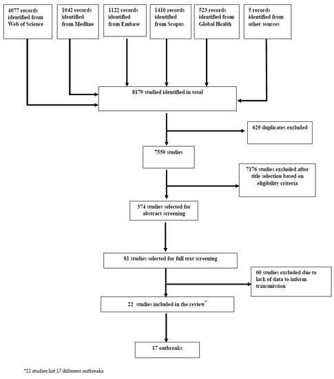 We identified 22 studies meeting the inclusion criteria, which described 17 different outbreaks. The outbreaks with evidence of transmission route from the selected studies are summarized in Table 1. Eight outbreaks involved very long-range transmission beyond a single building or location and nine involved transmission within a building that could not be explained by direct person to person contact. This included two outbreaks where transmission occurred vertically from one floor to another floor of a building.