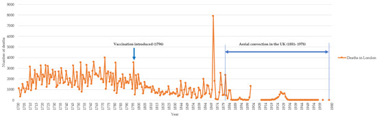 - Our World in Data. Deaths from Smallpox in London 1629–1902. Available online: https://ourworldindata.org/grapher/deaths-from-smallpox-in-london (accessed on 30 July 2019).