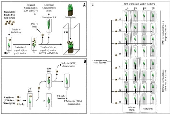 Schematic representation of the process applied to the field collected Psammotettix leafhoppers and of experimental procedures. (A) After characterization of Psammotettix species (COI genotyping) and viruliferous status (enzyme-linked immunosorbent assay (ELISA) and polymerase chain reaction (PCR)) of collected females, virus-free, viruliferous WDV-W and viruliferous WDV-B plastic cage rearing systems (PRS) were initiated (panel A). (B) The PRSs allow the production of viruliferous larvae (L3 and L4), males (M) and females (F) used in the characterization of transmission efficiency (panel B) and (C) virus-free males used in the study of sequential acquisition/inoculation of WDV-W and WDV-B (panel C). The host alternation procedures (barley plants in gray panels and wheat plants in white panels) applied to leafhoppers are presented by black arrows (HAP A to H). According to the host-alternation procedure (HAP), leafhoppers were maintained for 5 days of acquisition access period (AAP) on infected hosts (a single infected host was used for HAPs A to D and two infected hosts were used in HAPs E to H; infected hosts are represented by black tubes) and for 5 days of inoculation access period (IAP) on test plants (three test plants were used in HAPs A to D and 2 test plants were used in HAPs E to H; test plants are represented by white tubes). IRS: individual rearing system; M: leafhopper male; F: leafhopper female; L3–L4: larvae at development stage L3–L4.