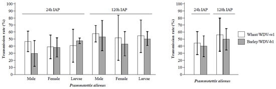 Transmission of WDV-w1 and WDV-b1 isolates by Psammotettix alienus males, females and larvae. Viruliferous insects (males, females and L3-L4 larvae) sampled from plastic cage rearing systems were used in transmission experiments based on 24 h and 120 h inoculation access periods (IAP). For each IAP/insect-type combination, WDV-w1 and WDV-b1 isolates were inoculated to sets of 10 wheat (WDV-w1) or 20 barley (WDV-b1) plantlets. The sanitary status of inoculated plants was determined by ELISA 4 weeks post-inoculation. Transmission rates associated with WDV-w1 and WDV-b1 are represented by white and gray bars, respectively. The whole experiment was repeated five (for WDV-b1) to ten (for WDV-w1) times. Black lines represent +/− 1 standard deviation.