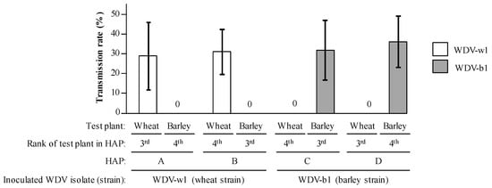 Inoculation of WDV-w1 or WDV-b1 isolates to wheat and barley plants using host alternation procedures (HAPs). Virus-free leafhoppers were allowed to acquire WDV on an infected plant for a 5-day acquisition access period (AAP). Then, according to HAP procedures A to D, leafhoppers were transferred every 5 days to a healthy wheat or barley plantlet. Ten leafhoppers were used in each HAP and the whole experiment was repeated six times. Sanitary status of third and fourth plants used in HAPs was assessed 4 weeks post-inoculation. Transmission rates associated with WDV-w1 and WDV-b1 are presented by white and gray bars, respectively. Black lines represent +/− 1 standard deviation. The HAPs are described in Figure 1C.