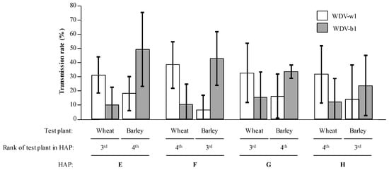 Co-inoculation of WDV-w1 and WDV-b1 isolates to wheat and barley plants using host alternation procedures (HAP). Virus-free leafhoppers were allowed to acquire both WDV-w1 and WDV-b1 isolates for a 5-day acquisition access period (AAP) on an infected wheat and for a 5-day AAP on infected barley. Then, according to HAP procedures E to H, leafhoppers were transferred every 5 days to a healthy wheat or barley plantlet. Ten leafhoppers were used in each HAP and the whole experiment was repeated six times. Sanitary status of the plants in third and fourth positions in the HAPs was determined 30 days post-inoculation using strain-specific PCR detection assays. Transmission rates associated to WDV-w1 and WDV-b1 are represented by white and gray bars, respectively. Black lines represent +/− 1 standard deviation. The HAPs are described in Figure 1C.
